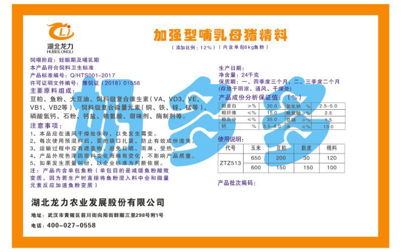 湖北龍力農(nóng)業(yè)發(fā)展股份有限公司坐落于武漢市黃陂區(qū)前川街向陽街群順三里298號附1號。公司成立于2014年6月,公司自成立以來把“創(chuàng)全球最大養(yǎng)豬綜合服務(wù)”為企業(yè)愿景。致力于打造教保料品牌”作為公司發(fā)展的明確目標。公司一直致力于豬營養(yǎng)的研究和開發(fā),積極與國內(nèi)外高校和科研機構(gòu)合作,推廣養(yǎng)豬技術(shù)、動物營養(yǎng)新概念,向世界農(nóng)牧企業(yè)學習與合作。公司采用國內(nèi)先進的生產(chǎn)工藝,選擇高精度電子配料秤,高均勻度、無殘留混合機等先進設(shè)備....